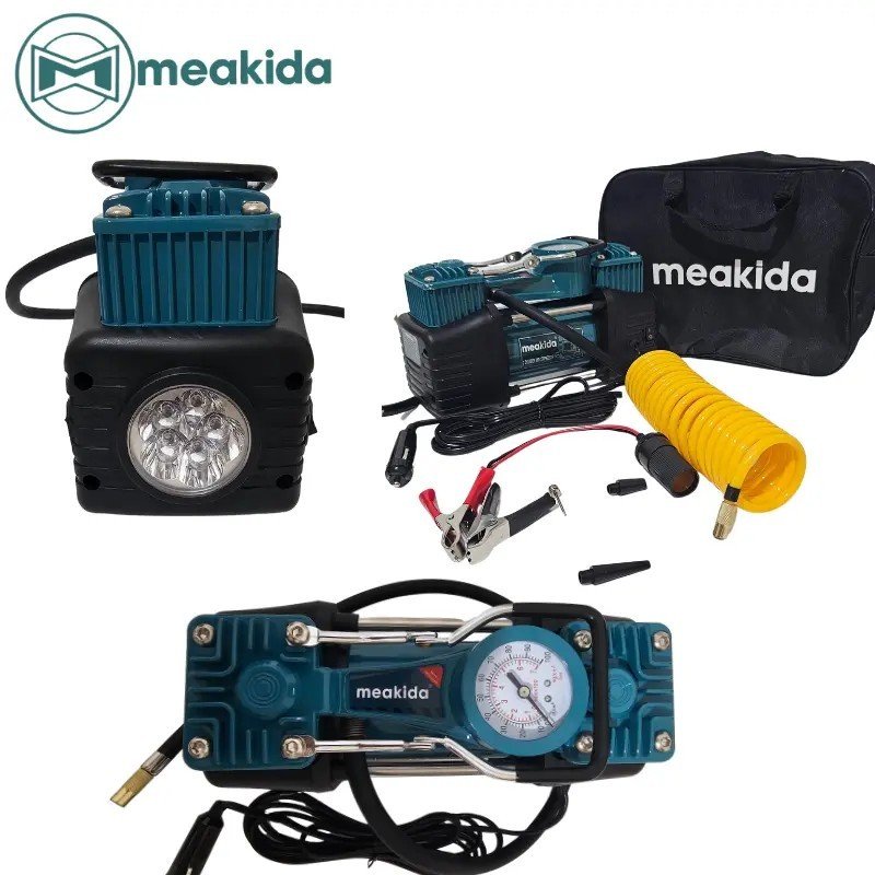 Compresseur d’air 12V Meakida, idéal pour une utilisation nomade (voiture, camping, petits travaux). Alimentation via allume-cigare ou batterie 12V, sans besoin de source électrique fixe.