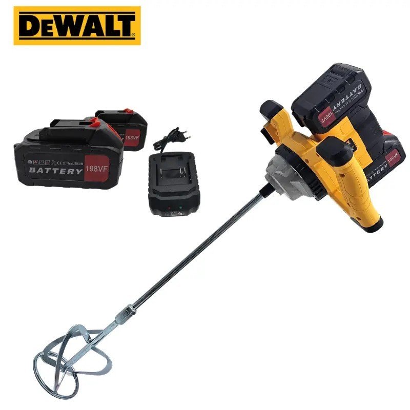 Malaxeur DeWalt avec 2 batteries offrant un couple élevé et une durée d’utilisation prolongée pour mélanger mortier, peinture ou enduit sans interruption.