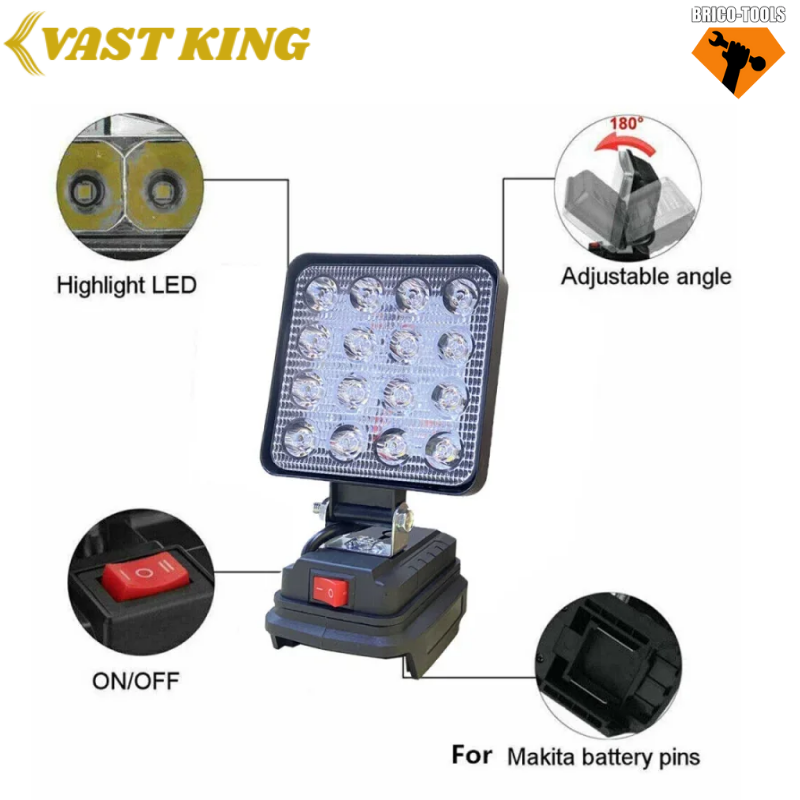 Cette torche d’appoint Vast King se branche directement sur les batteries Makita et offre un angle réglable à 180° pour un éclairage ciblé où vous en avez besoin. Avec son spot LED haute luminosité et son interrupteur facile d’accès, elle est l’accessoire idéal pour les chantiers, les ateliers ou les dépannages.